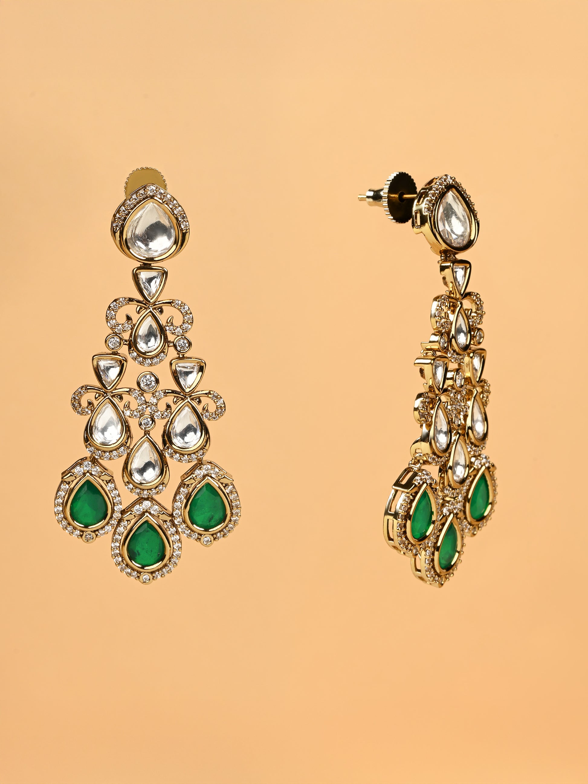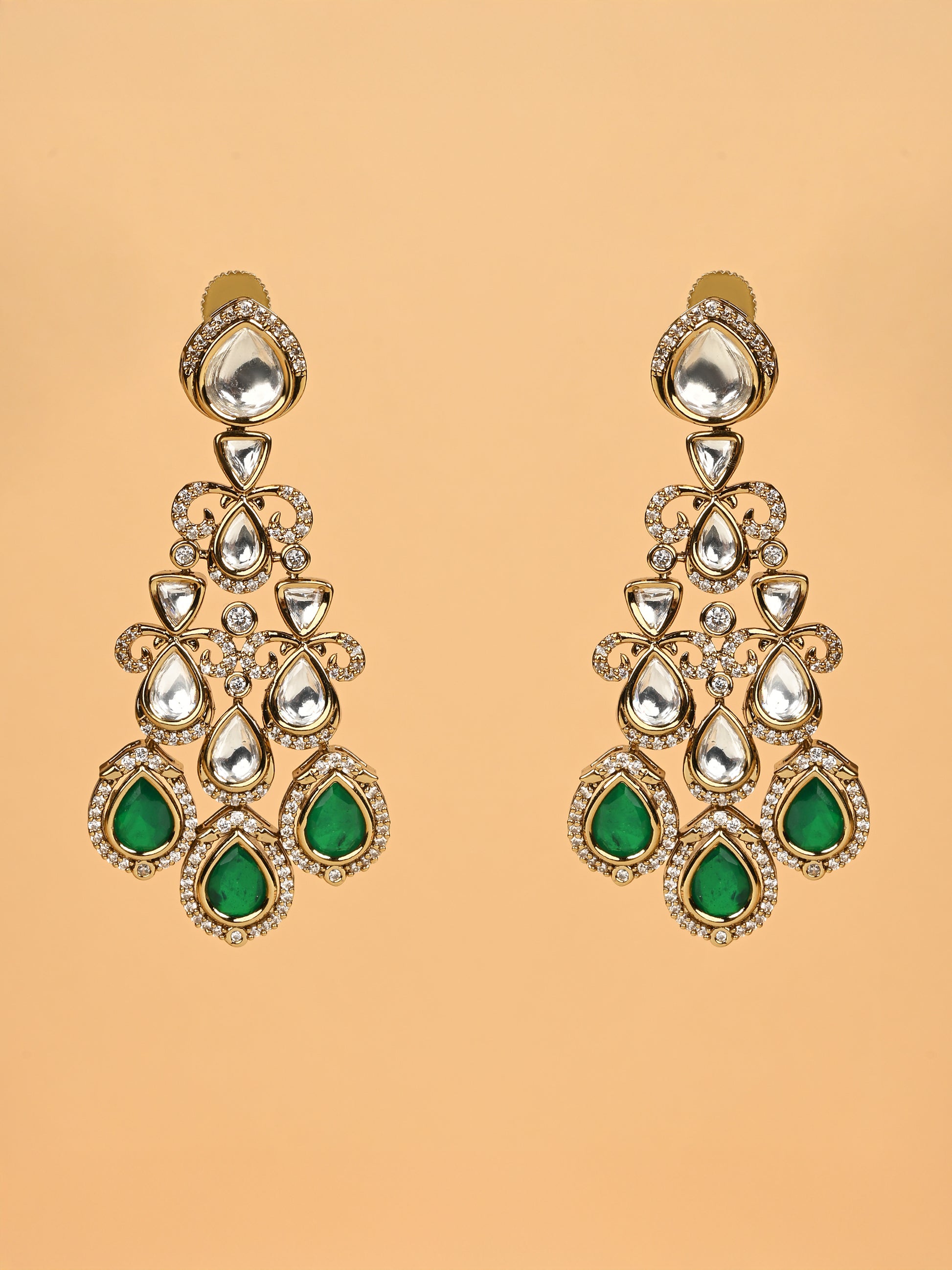 Commanding elegance fit for a queen, the Malika Drops embody timeless grandeur and heritage artistry. Sparkling kundan teardrops cascade gracefully into rich emerald drops, each haloed with delicate diamonds to create a majestic chandelier silhouette.