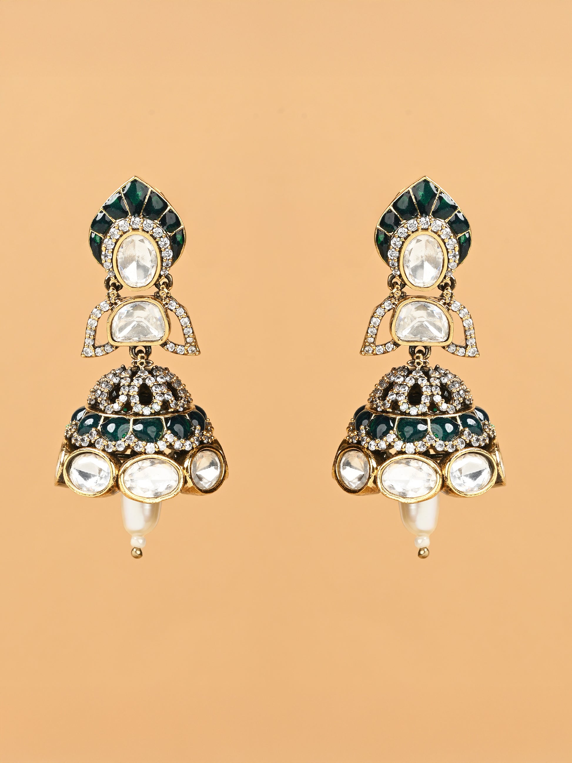 The Heer Noor Jhumkas shine like jewels of love and light. With emerald tones symbolizing prosperity and shimmering stones that glow with every movement, these earrings are finished with a pearl drop — a graceful nod to tradition and beauty.
