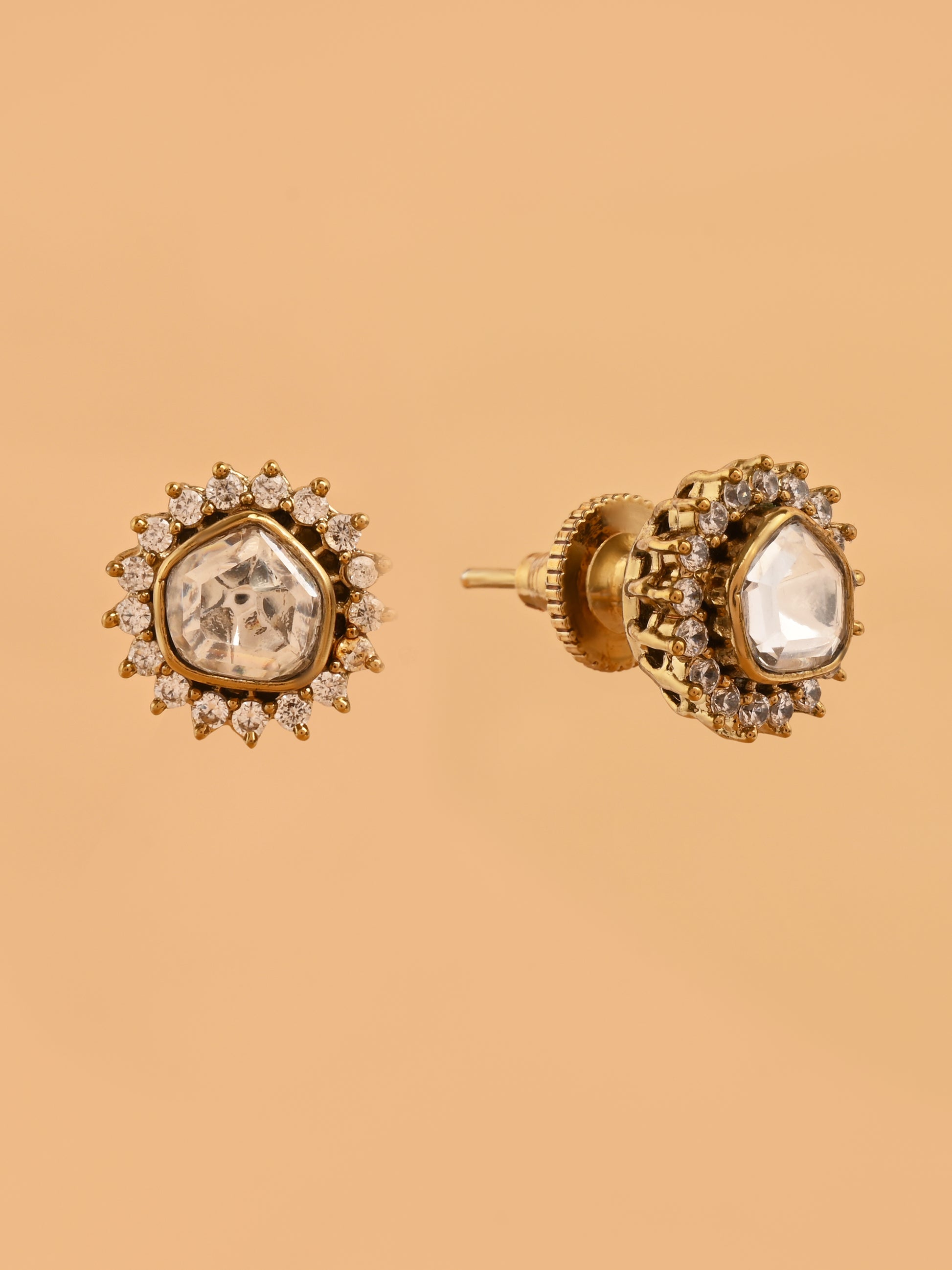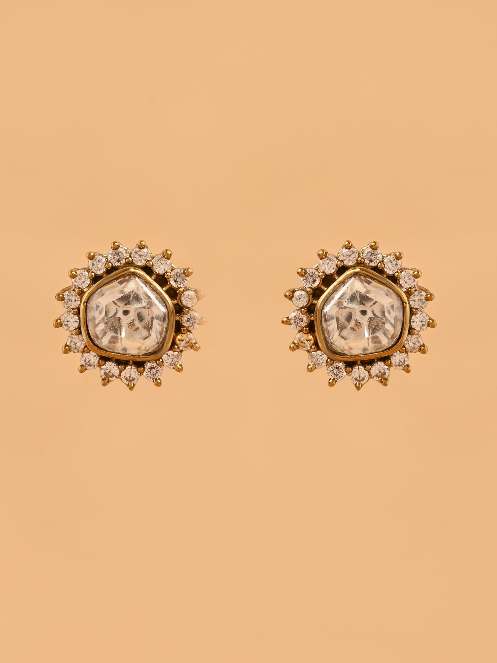 Elevate your everyday elegance with the Eshna Kundan Studs. Featuring a radiant central Kundan stone encircled by a delicate halo of shimmering crystals, these handcrafted studs are a timeless blend of tradition and modern charm. Lightweight yet impactful, they are perfect for festive occasions, weddings, or adding a regal touch to your daily look.