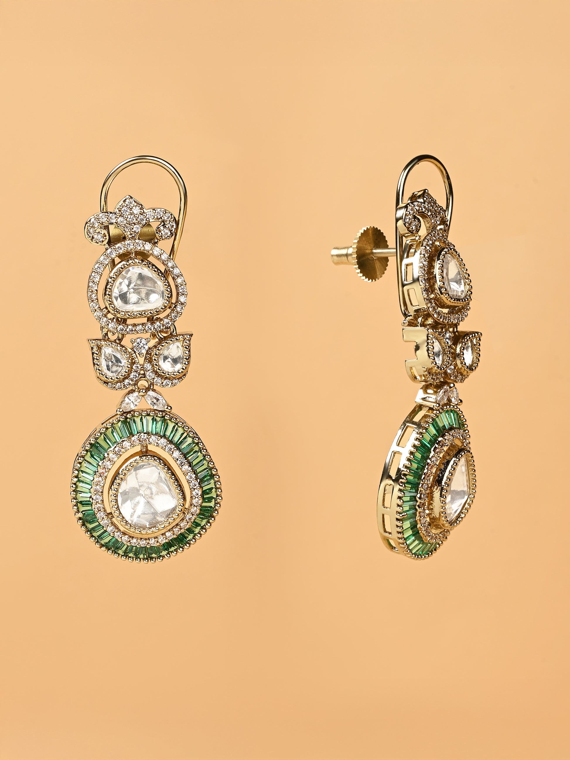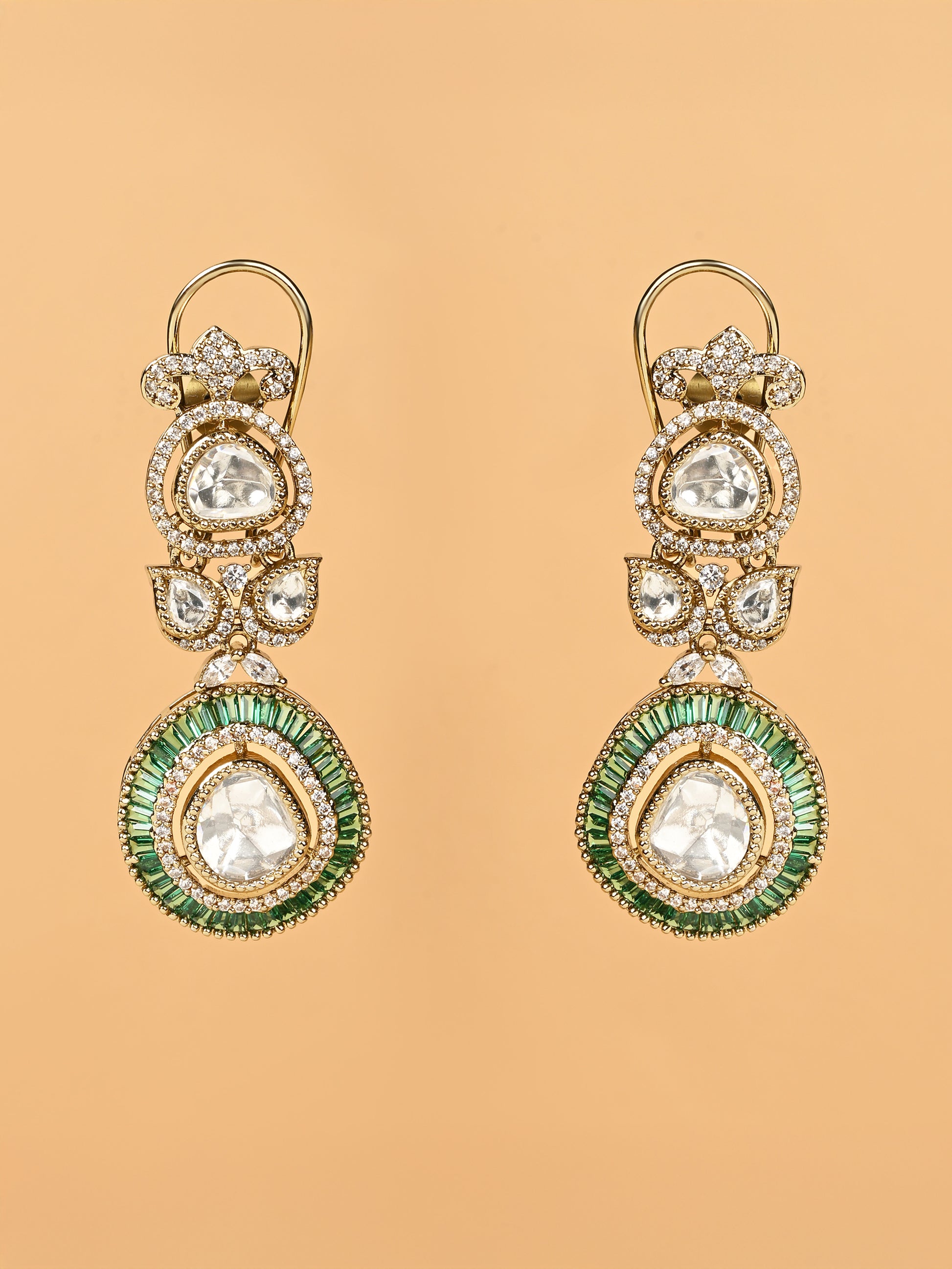 Radiating elegance with every shimmer, the Celestial Drops earrings are crafted to mirror the brilliance of starlit skies. Featuring layered crystal-white stones and a bold teardrop framed in emerald hues, this masterpiece captures both heritage artistry and timeless sophistication.