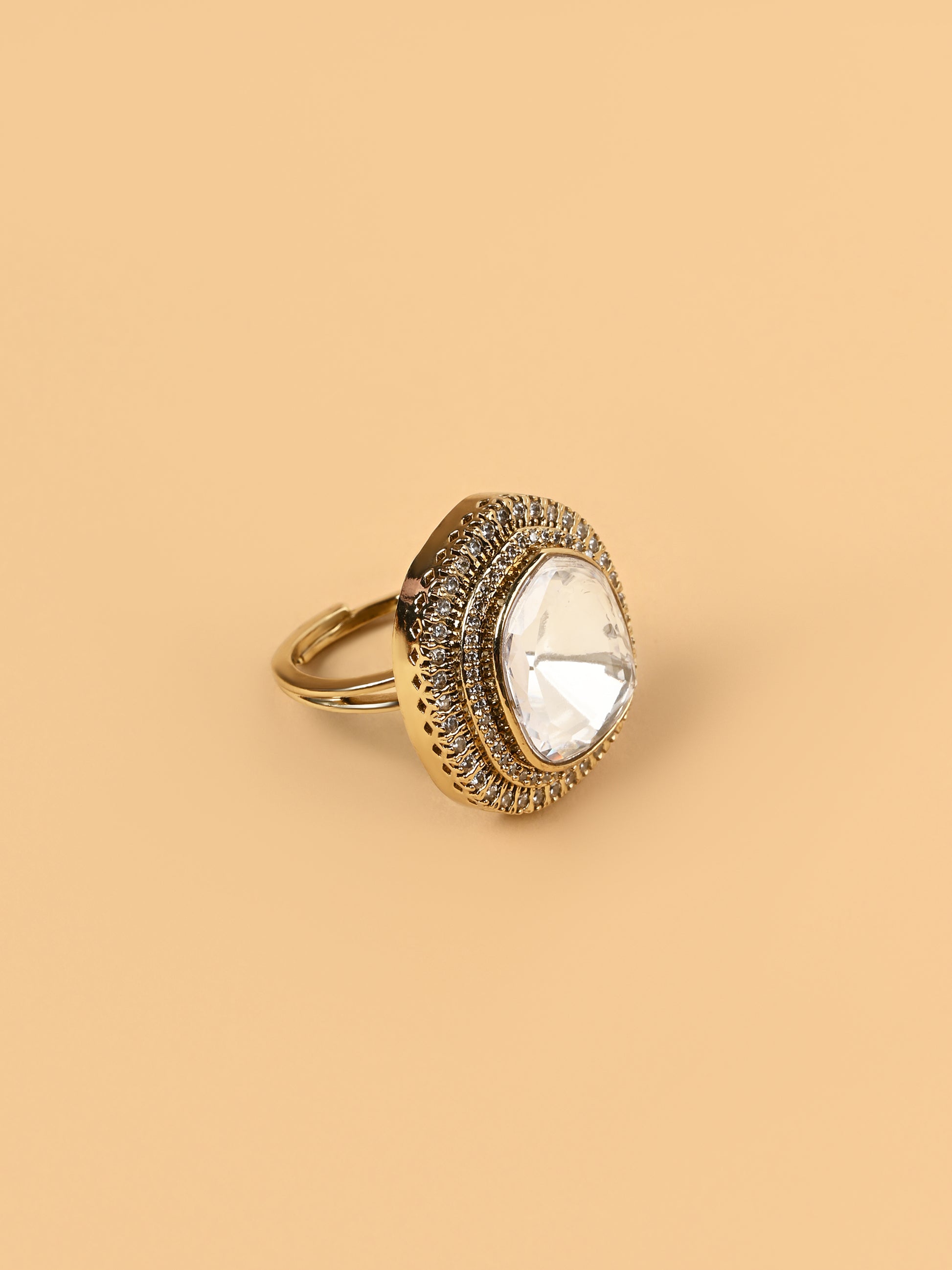 The Noor-e-Kundan Ring is a striking blend of heritage craftsmanship and modern allure. Its centerpiece, a luminous uncut-style stone, captures the light effortlessly, while the double halo of sparkling crystals enhances its radiance.Β