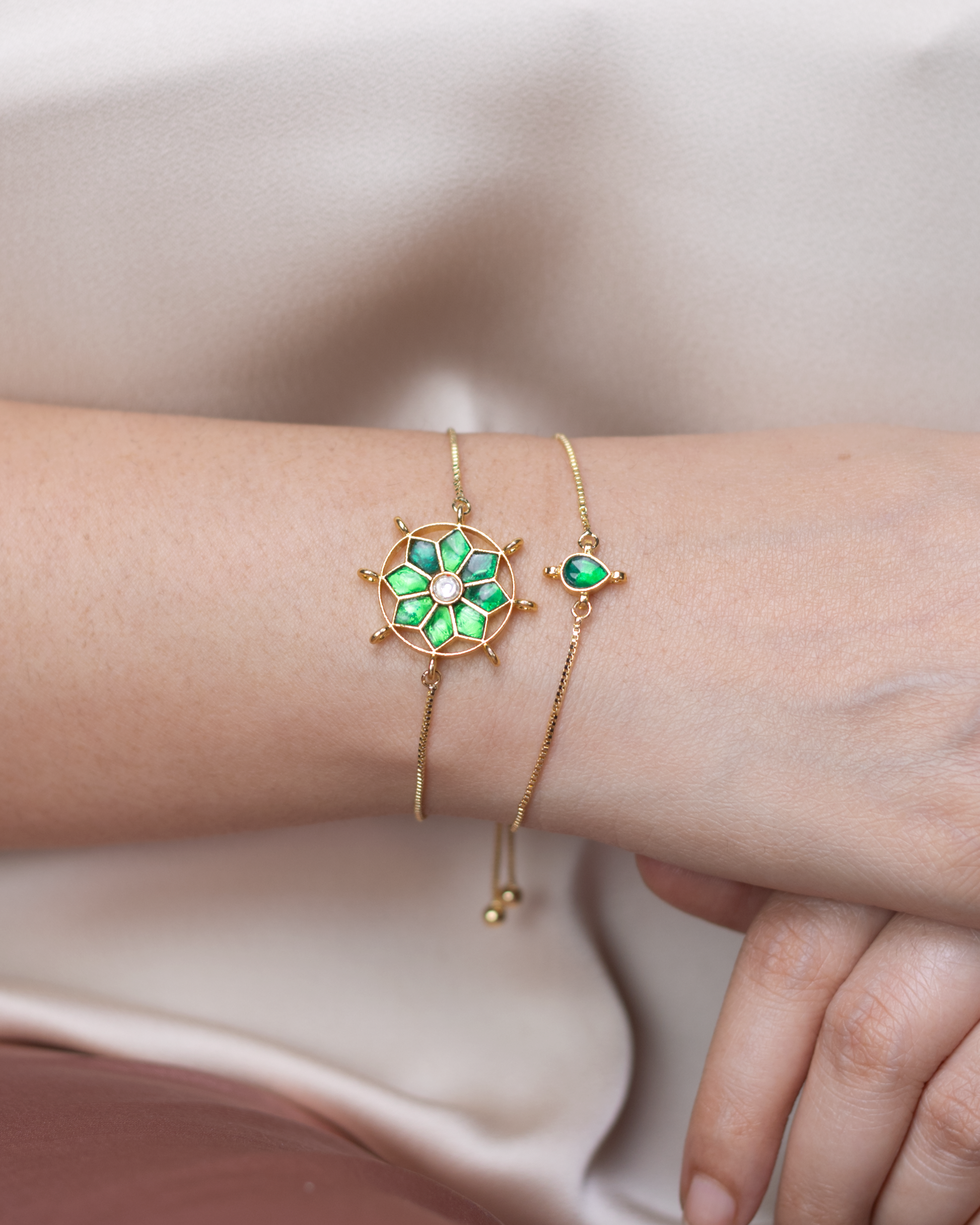 The Meher Kundan Bracelets exude a timeless charm with their exquisite floral-inspired design. Handcrafted with precision, these bracelets feature intricate Kundan work and rich emerald green enamel, symbolizing prosperity and grace. The delicate chain with adjustable sliders ensures a perfect fit, making them an effortless blend of tradition and modernity.