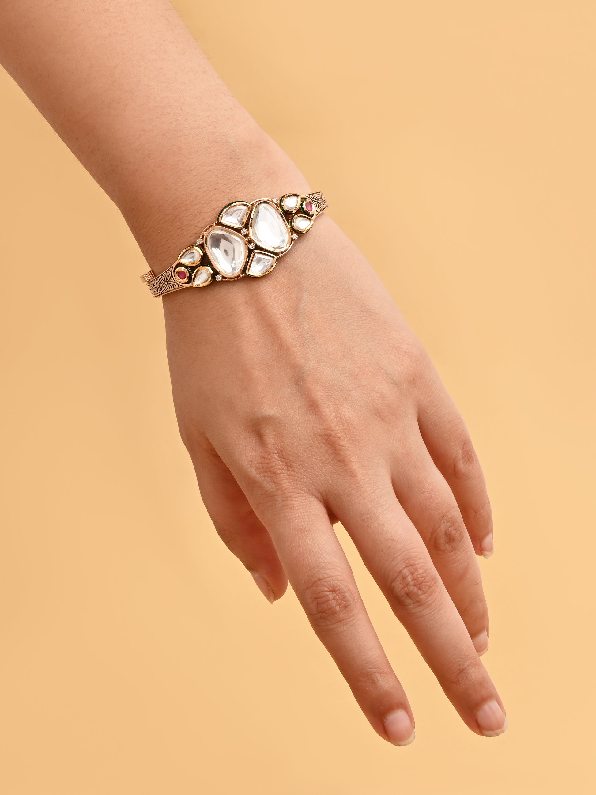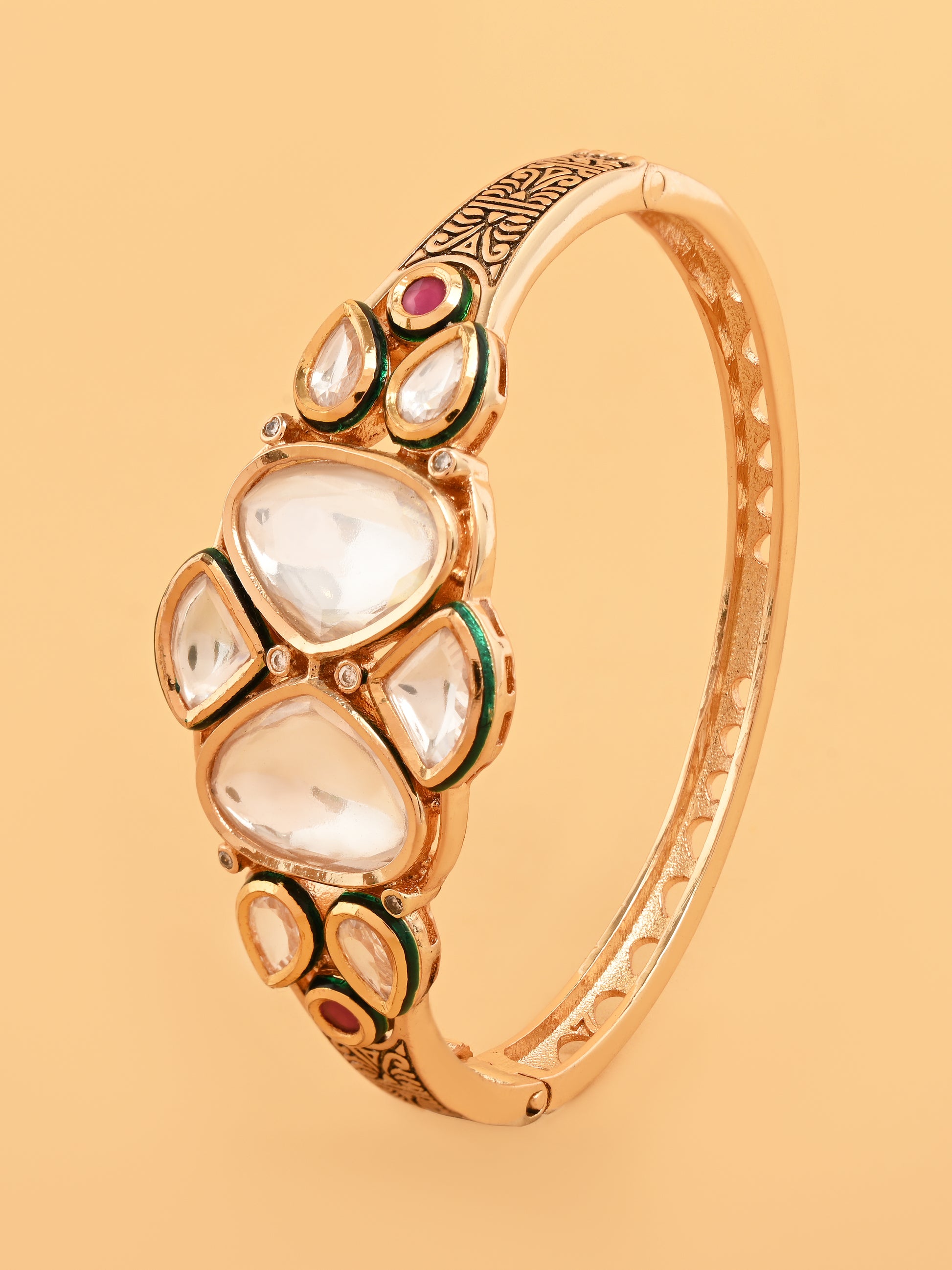 Step into royal grandeur with our Rajwada Kada, a masterpiece inspired by the opulence of heritage jewellery. Adorned with bold uncut kundan stones framed in rich green enamel and accented with deep ruby tones, this kada tells a story of regal tradition. The intricate engravings on the band add an old-world charm, making it not just an ornament but a legacy. Perfect for weddings, festivities, or as a statement heirloom piece, the Rajwada Kada is designed for those who carry timeless elegance with pride.