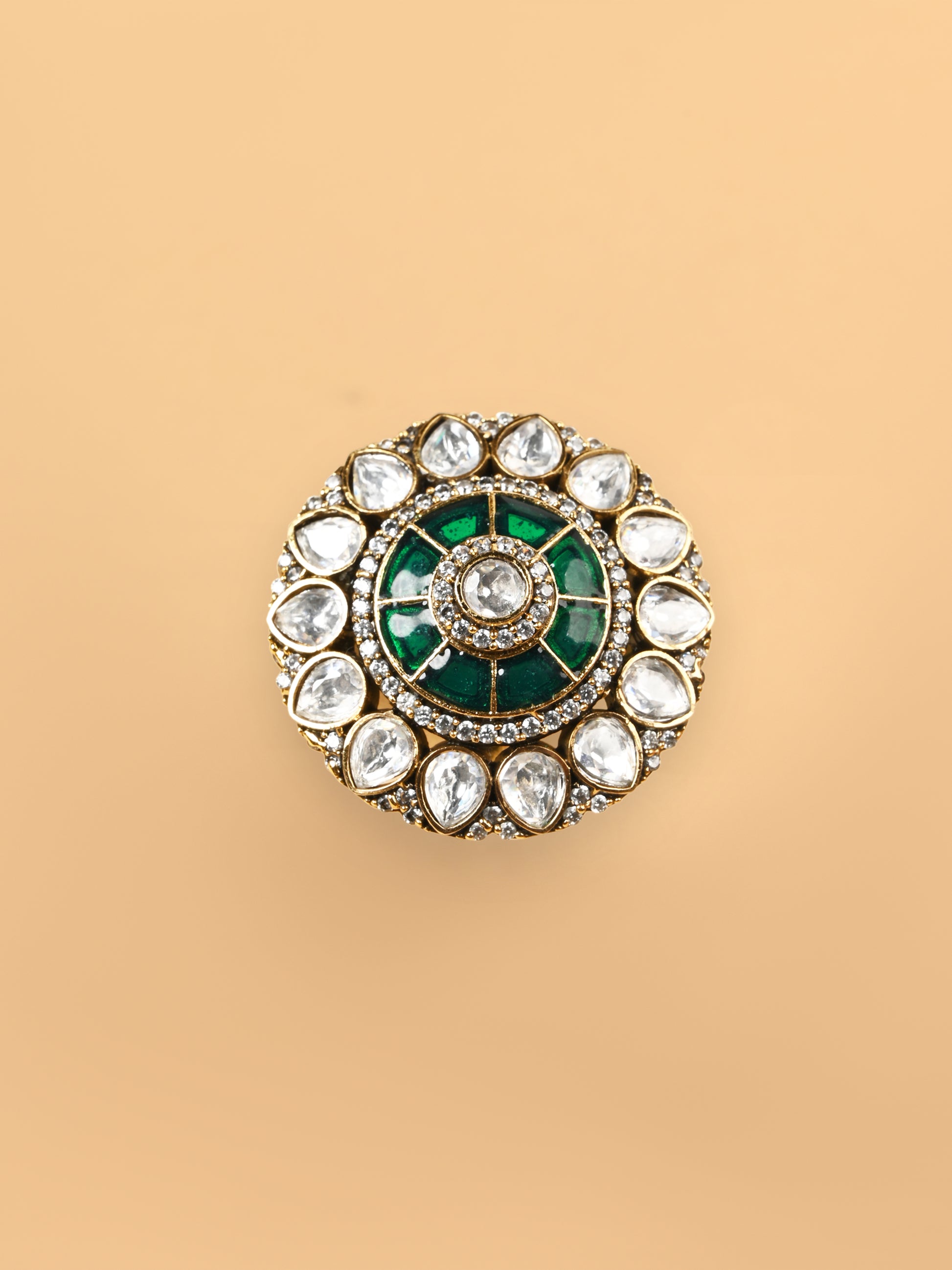 The Amrapali Kundan Ring is a radiant celebration of heritage artistry. Handcrafted in Kundan, its bold round silhouette is adorned with a lush green enamel center and encircled by luminous uncut kundan stones, creating the effect of a blooming flower kissed by light.