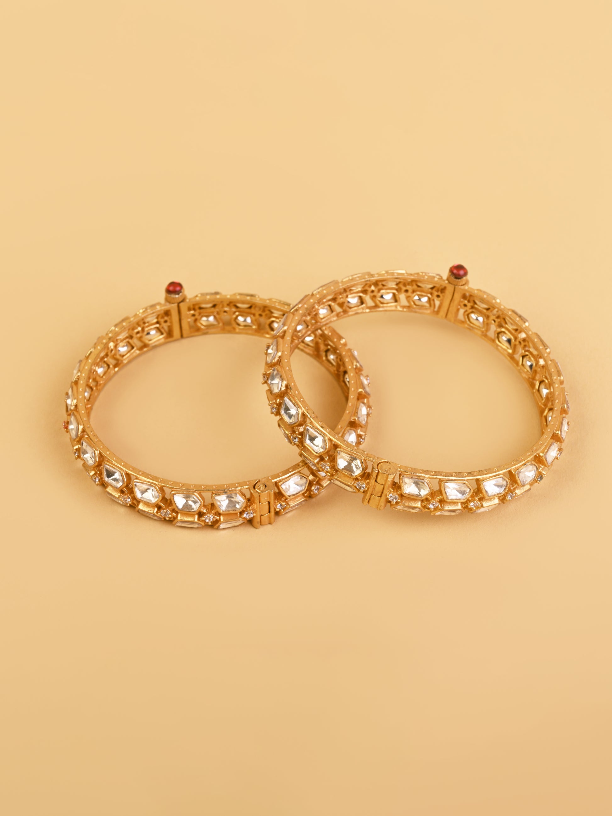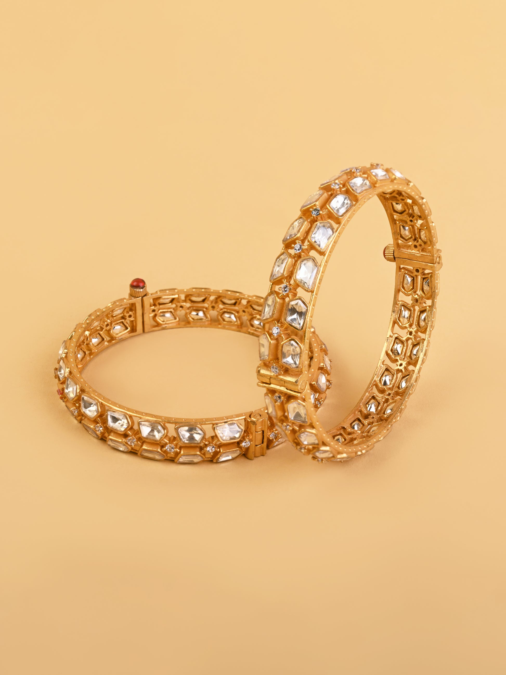 Upgrade your jewellery collection with Rani Saa Moissanite Bangle. These moissanite bangles are adorned with a luxurious 18k gold polish. The Rani Saa Moissanite Bangle features intricate Moissanite polki that add a touch of luxury and elegance to any outfit. With its high-end design and materials, this bangle is the perfect accessory for any special occasion.
