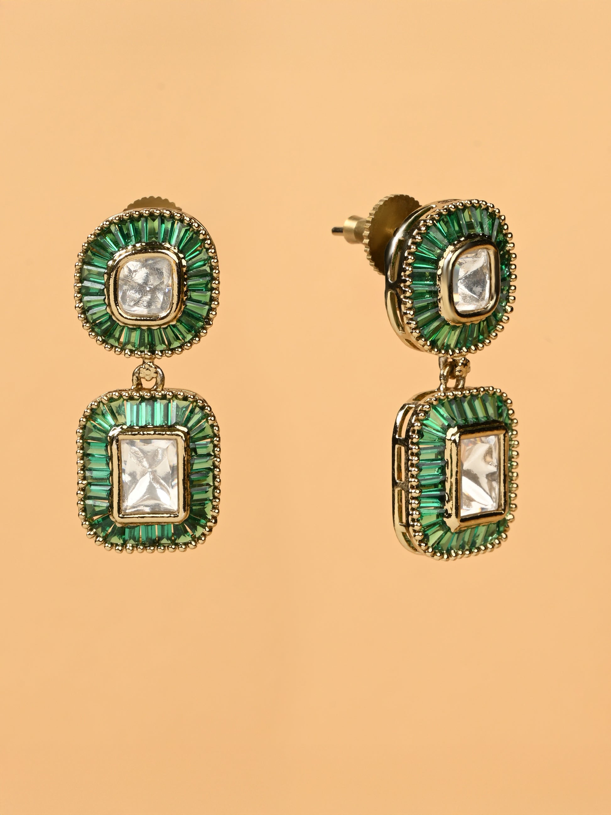 The Emerald Radiance Earrings are designed to make a statement. Featuring luminous white stones framed with rich green baguettes, these earrings exude a royal charm that complements both ethnic and fusion looks. Perfect for weddings, festive evenings, or glamorous nights out.