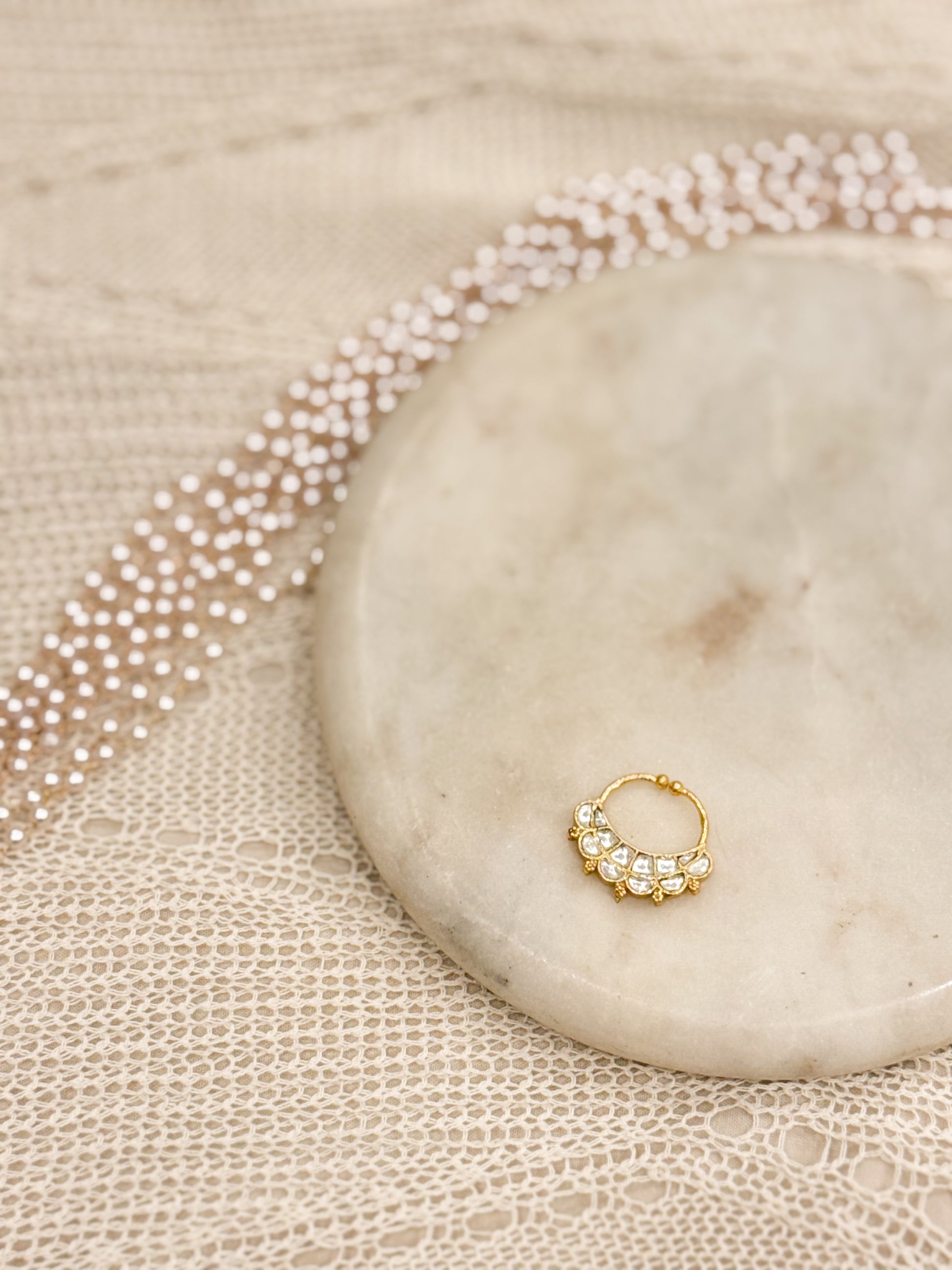 This Safed Chand Kundan Nath is expertly crafted with precision and attention to detail. Made with high-quality materials, it showcases exquisite Chand Kundan work. Experience luxury and elegance with this exquisite piece of jewelry.