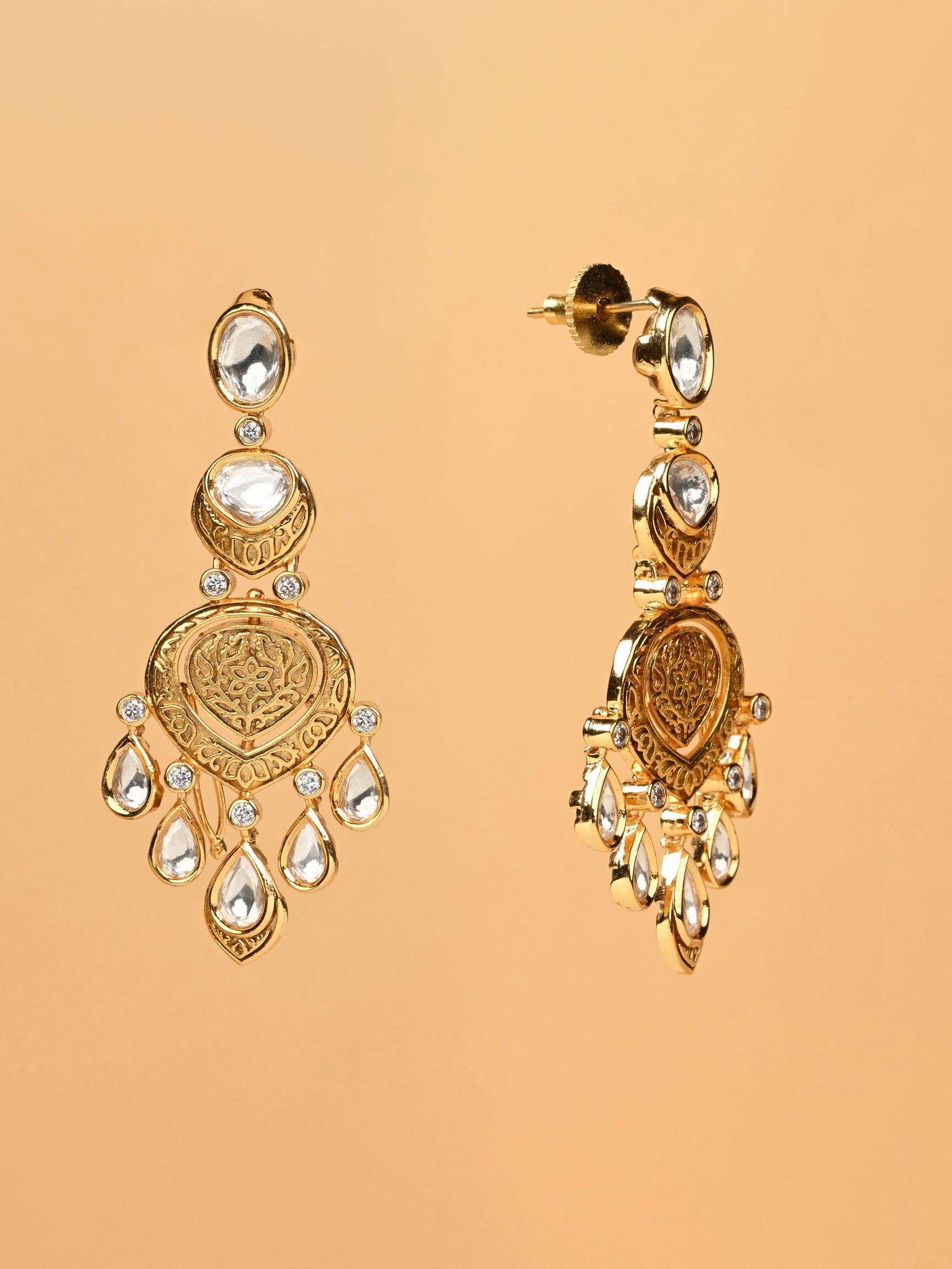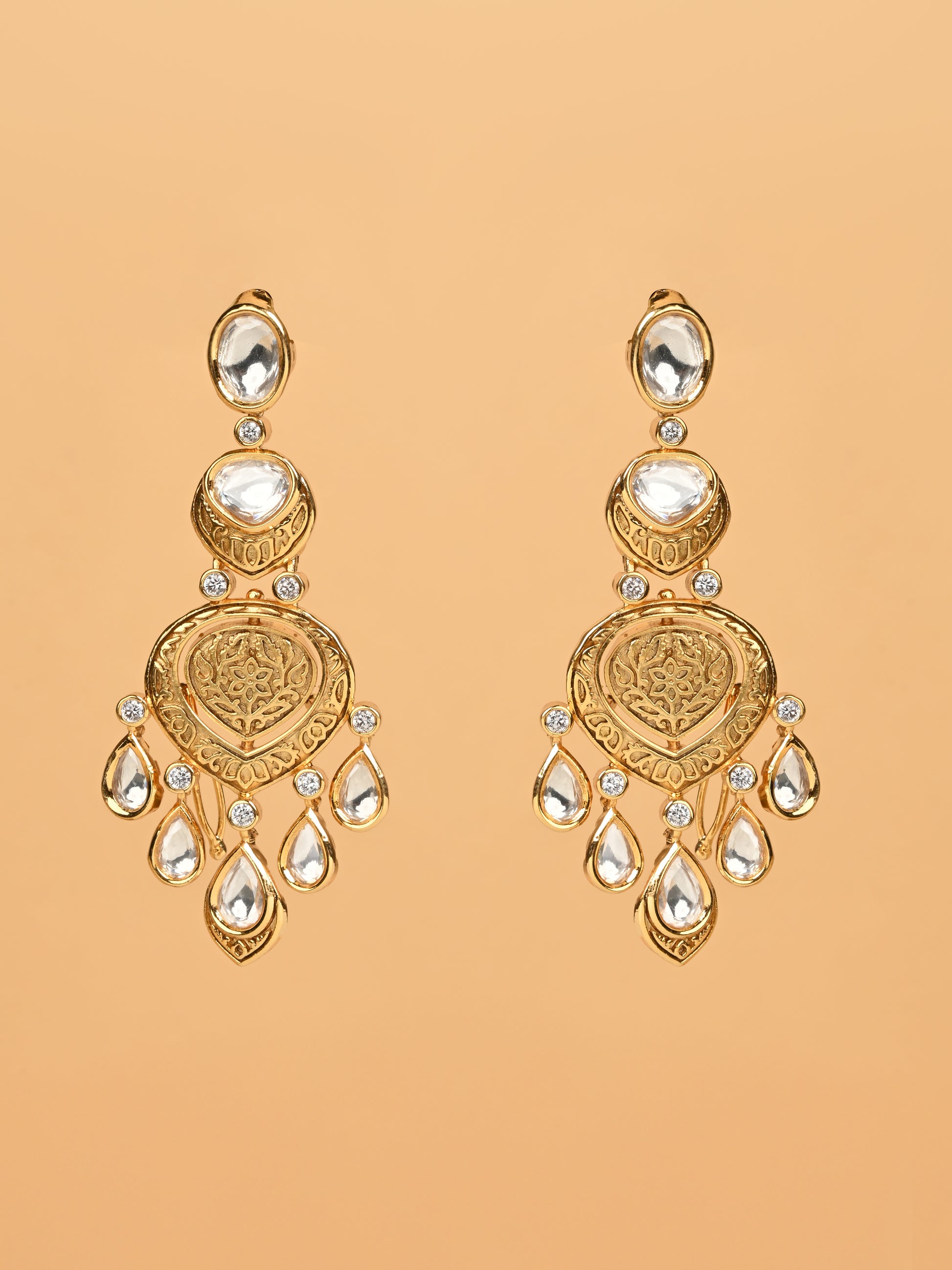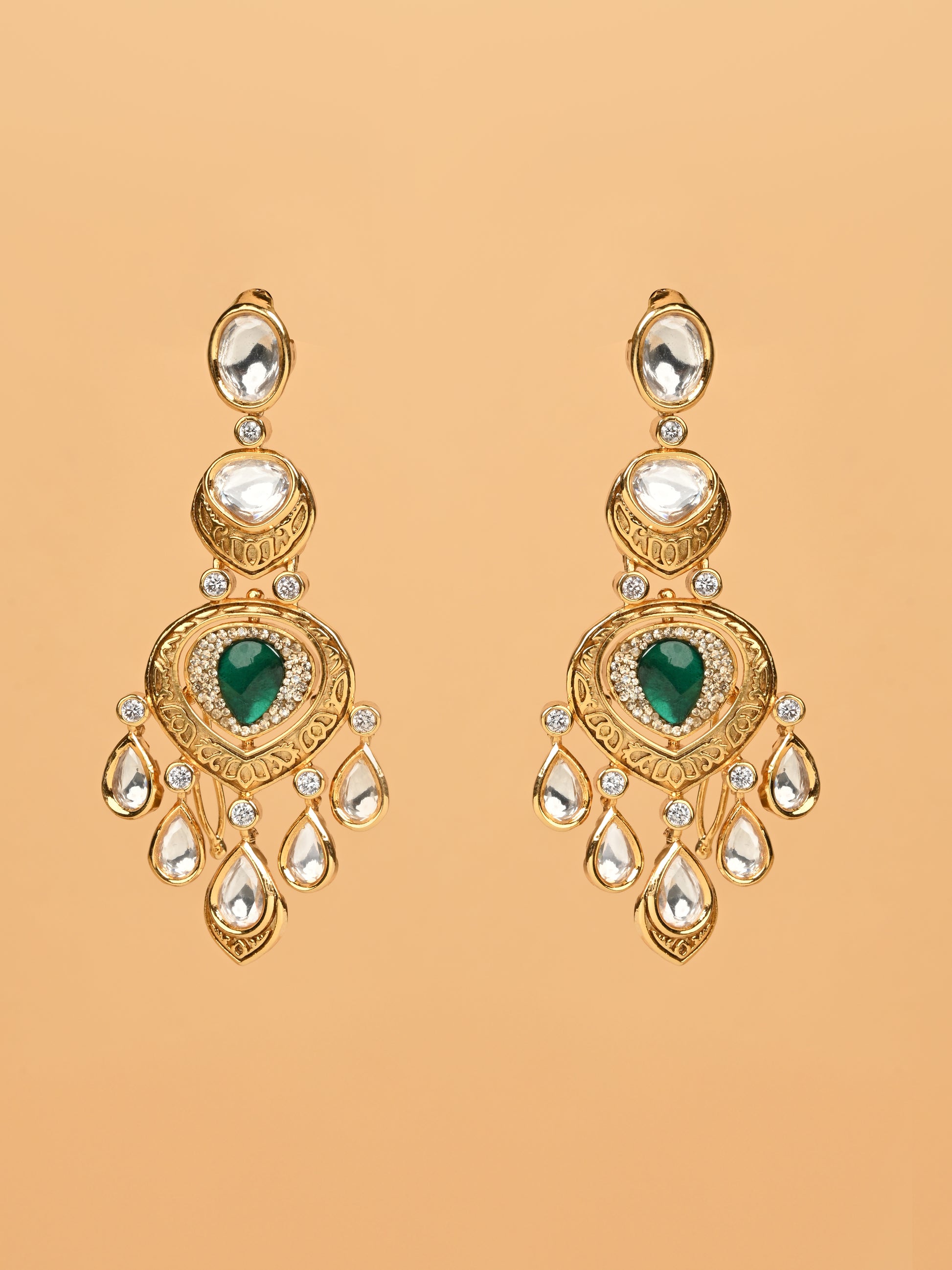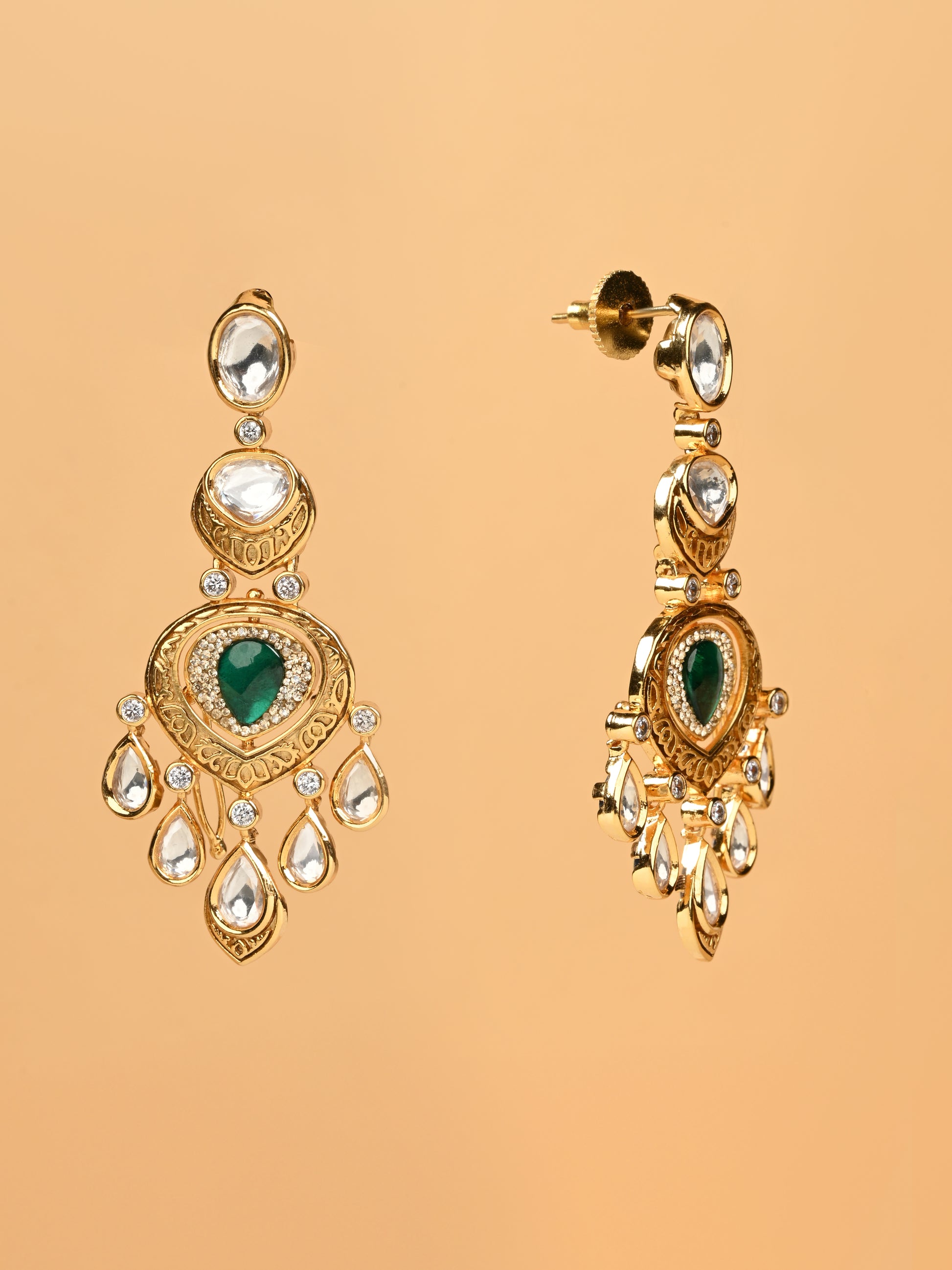 Grace flows through the Dilruba Drops, where artistry meets innovation. The emerald heart at the center rotates gently, offering two looks in one β a playful yet regal twist to heritage jewelry. Surrounded by shimmering crystal drops, these earrings capture the essence of love, light, and everlasting beauty.